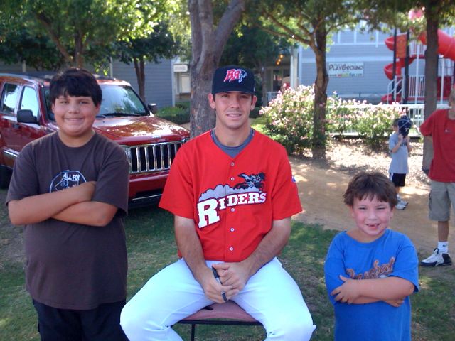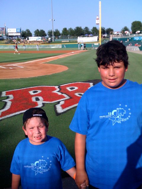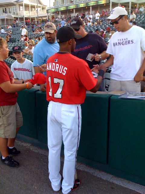 The highlight of the evening was getting to take Randy and Brian down on the field before the game. They got their picture taken with a pitcher named Michael Schlact, and we walked right past hot SS prospect Elvis Andrus.